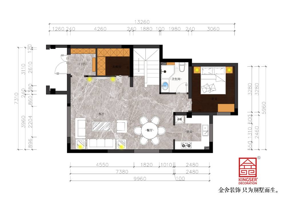 劃分原始門(mén)廳為兩個(gè)獨(dú)立空間,一個(gè)為獨(dú)立門(mén)廳,另一個(gè)為儲(chǔ)物衣帽間。