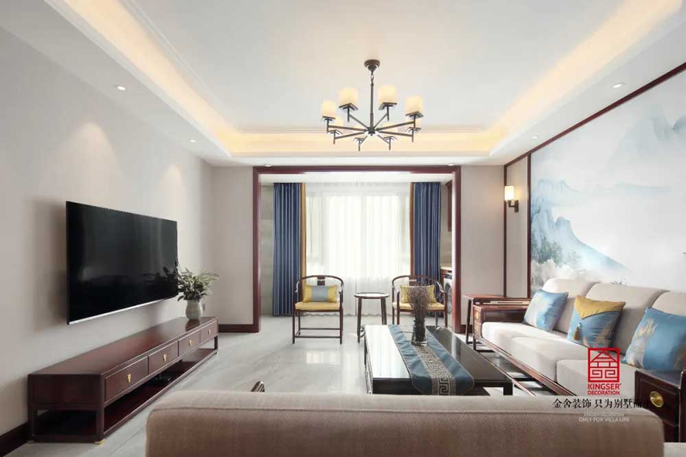 此案例為石家莊金舍裝飾-保利拉菲公館150平米新中式風格裝修實景。新中式風格發(fā)展到現(xiàn)在就像是一個已經(jīng)趨近飽和的瓶子一樣,有水進去自然就會有水流出。對于中式風格來說,每個元素都是不可或缺的一部分,從古代石刻窗格的各種吉慶元素,到現(xiàn)在已經(jīng)簡化到只剩下核心的顏色和少量的配飾,拋繁就簡,回歸平淡,這是一種發(fā)展,也是一種人們對于簡單生活的憧憬和向往。