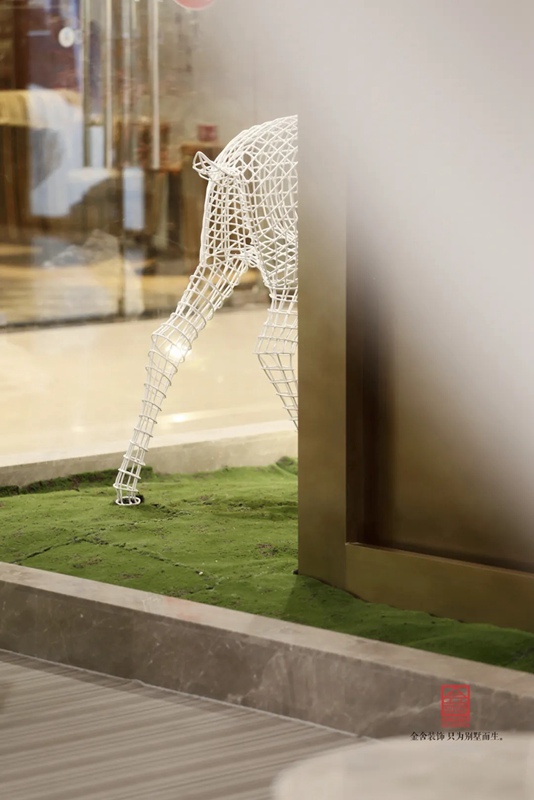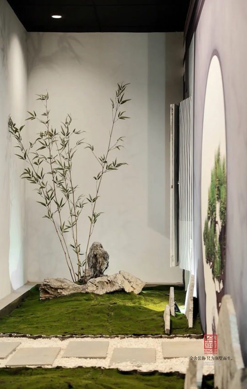 -御河上院在商場的樓盤展示區(qū)裝修實景,在設計中將自然與人文的意象融入室內設計,綠意盎然的自然景象以其深厚的文化底蘊滋潤著人們的心靈,對自然的認識和感悟,讓人豁然開朗,心曠神怡,也就成為中國傳統(tǒng)文化資產的傳承、轉譯與新生 。