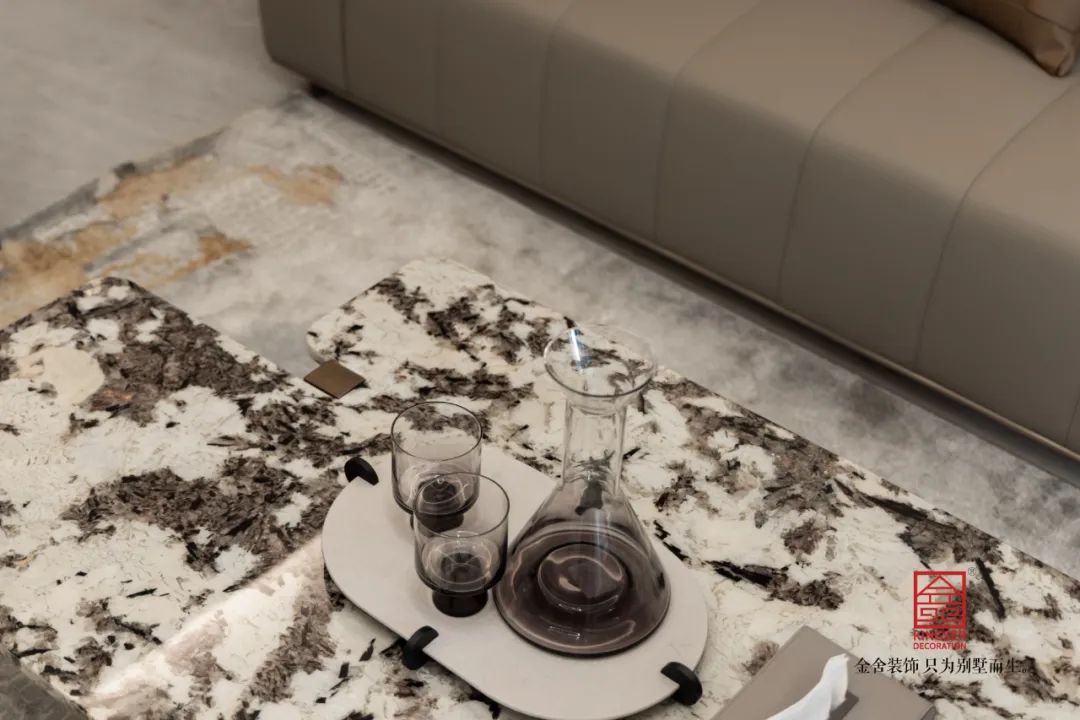 深色的墻板與大理石的配合,讓兩種不同明暗的材質(zhì)在同一空間出現(xiàn)激情的碰撞,明暗蜿蜒的大理石紋理,也讓整個(gè)空間出現(xiàn)了一種流動(dòng)感。沙發(fā)背景墻采用水墨山水的背燈硬包,讓空間增加了一份東方意味。