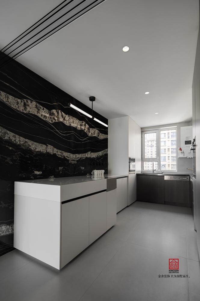 乍一看起來是一個(gè)開敞的廚房,其實(shí)還做了一個(gè)隱形門,既保證了采光,也讓整個(gè)空間更加的舒適整潔,黑與白相間的背景石材如同江河奔涌,充滿了未知與希望。