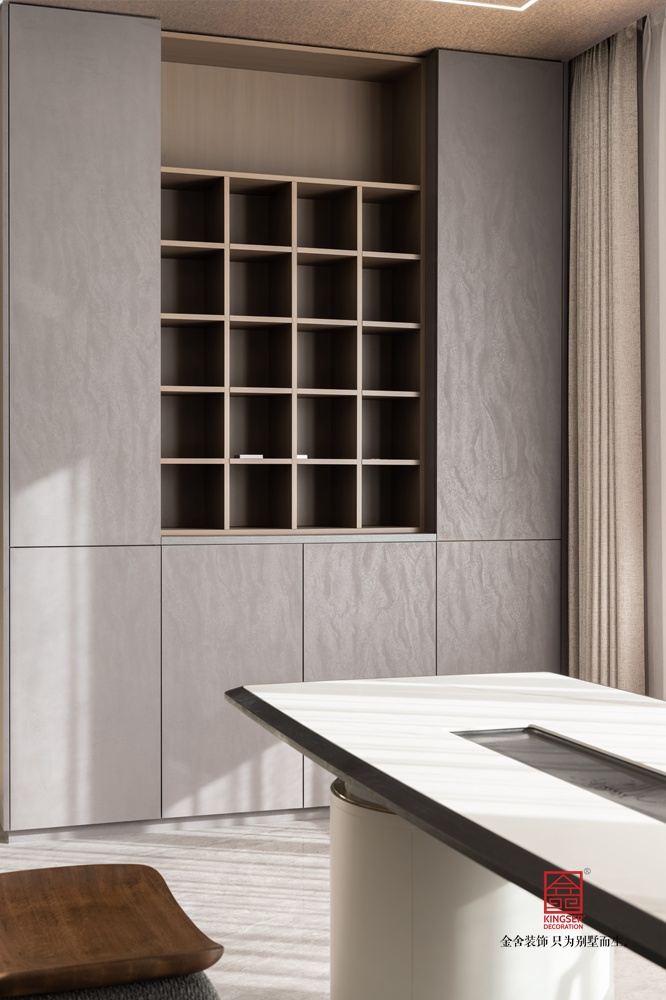 如滔滔江水傾瀉而下的石材肌理,赭石與黑色的顏色對撞,石材的堅(jiān)硬與皮制的溫潤的融合,金屬的邊緣與整體溫暖的配色,這是客戶對生活的向往,也是對美好未來的構(gòu)建。