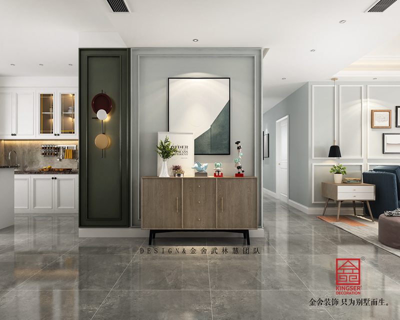 開門入戶,時(shí)尚混搭氣息撲面而來,左手邊是墨綠的靜謐與凹凸有致的線條搭配時(shí)尚跳色壁燈,金色與綠色在光照下的沖撞感,右邊棱角分明的玄關(guān)柜,黑色磨砂質(zhì)感的金屬腿,呼應(yīng)上精致復(fù)古的墨綠色掛畫邊框,每一個(gè)細(xì)節(jié)都將精美質(zhì)感伶俐體現(xiàn),一個(gè)時(shí)尚復(fù)古的北歐之家,就這樣映入眼簾……
