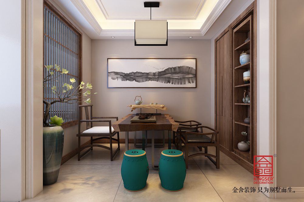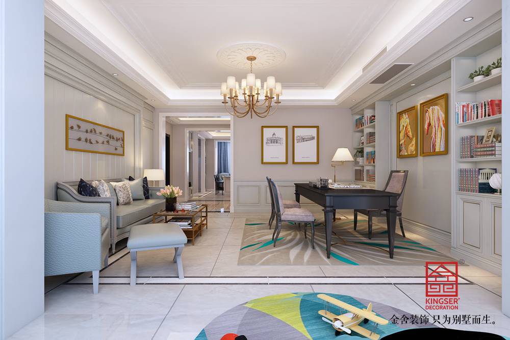 設計說明:此案例為石家莊金舍裝飾-榮盛華府200平米混搭風格裝修效果圖。傳統(tǒng)的客廳以電視墻為主導,沙發(fā)和茶幾的高度往往相差不大,這樣的高度差對于孩子寫作業(yè)或是成年人看書寫字和使用電腦是沒有舒適度可言的,因此一些有工作和學習需求的家庭可以考慮把家庭工作室融入客廳,利用靠墻的大操作臺和各種墻面擱板架,滿足多人工作的需求