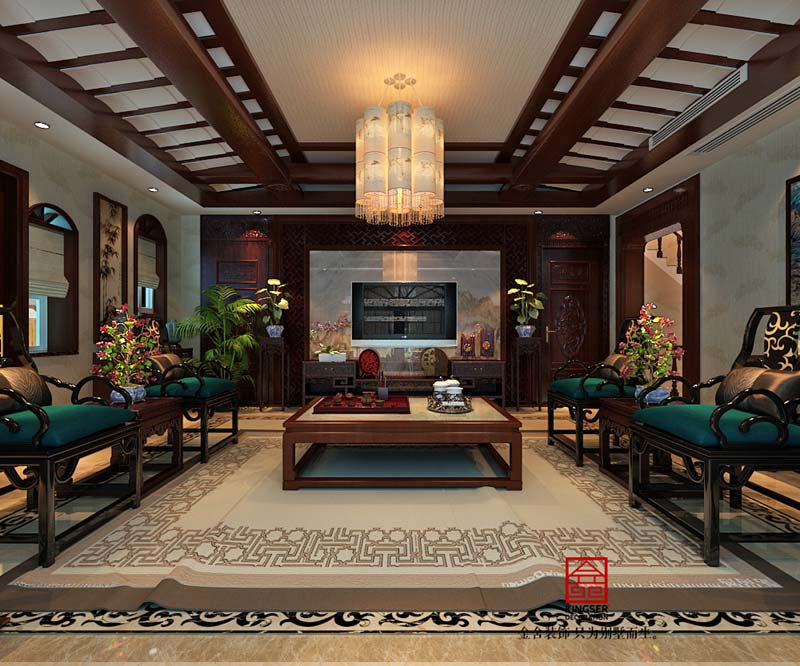 中式風(fēng)格的室內(nèi)設(shè)計(jì)古樸典雅,能反映出強(qiáng)烈的民族文化特征,使觀(guān)者很容易理解其文化內(nèi)涵,特別是對(duì)國(guó)人和對(duì)古文化興趣濃厚的人 更是有著一種莫名的親和力,所以設(shè)計(jì)師根據(jù)業(yè)主喜愛(ài)中國(guó)古文化的需求 采用了中式風(fēng)格的設(shè)計(jì),但是在室內(nèi)的中式設(shè)計(jì)中要注意加入現(xiàn)代的元素,比如客廳中擁有著現(xiàn)代元素藍(lán)色基調(diào)的坐墊以及抽象裝飾畫(huà)搭配上深紅色實(shí)木家具展現(xiàn)出了中式元素和現(xiàn)代材質(zhì)的巧妙兼容,同時(shí)頂面輕質(zhì)深色木梁以及電視背景墻水墨畫(huà)的相結(jié)合透漏出一種沉穩(wěn)而源遠(yuǎn)流長(zhǎng)的中國(guó)傳統(tǒng)文化,這種絕妙的組合給人以強(qiáng)烈的視覺(jué)沖擊,將時(shí)尚與古典巧妙的相結(jié)合,再加上補(bǔ)充光的暖色 使整個(gè)空間更加的舒適而具有層次感,又符合現(xiàn)代人追求的典雅、實(shí)用性。