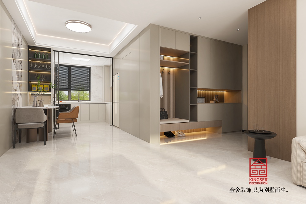 材質(zhì)上,原木的自然質(zhì)感、大理石的光潔以及金屬的精致相互融合,層次豐富。燈光設(shè)計(jì)巧妙,嵌入式燈帶與頂燈營造出柔和均勻的光照,凸顯空間通透感。整體設(shè)計(jì)摒棄傳統(tǒng)客廳的刻板,以實(shí)用與美學(xué)兼具的布局,為居者帶來更具個性與深度的生活體驗(yàn),詮釋了去客廳化設(shè)計(jì)對生活方式的創(chuàng)新與升級。