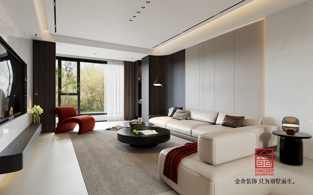 淺米色的大沙發(fā),搭配色彩層次豐富的抱枕,為休憩提供舒適且具美感的載體。黑色圓形組合茶幾,造型簡(jiǎn)約又不失設(shè)計(jì)感,與整體空間的利落線條相呼應(yīng)。一旁的白色單人沙發(fā),搭著紅色織物,既豐富了色彩層次,又增添了溫馨感,紅色異形休閑椅更是以亮眼色彩和獨(dú)特造型,成為空間的點(diǎn)睛之筆,注入藝術(shù)活力。