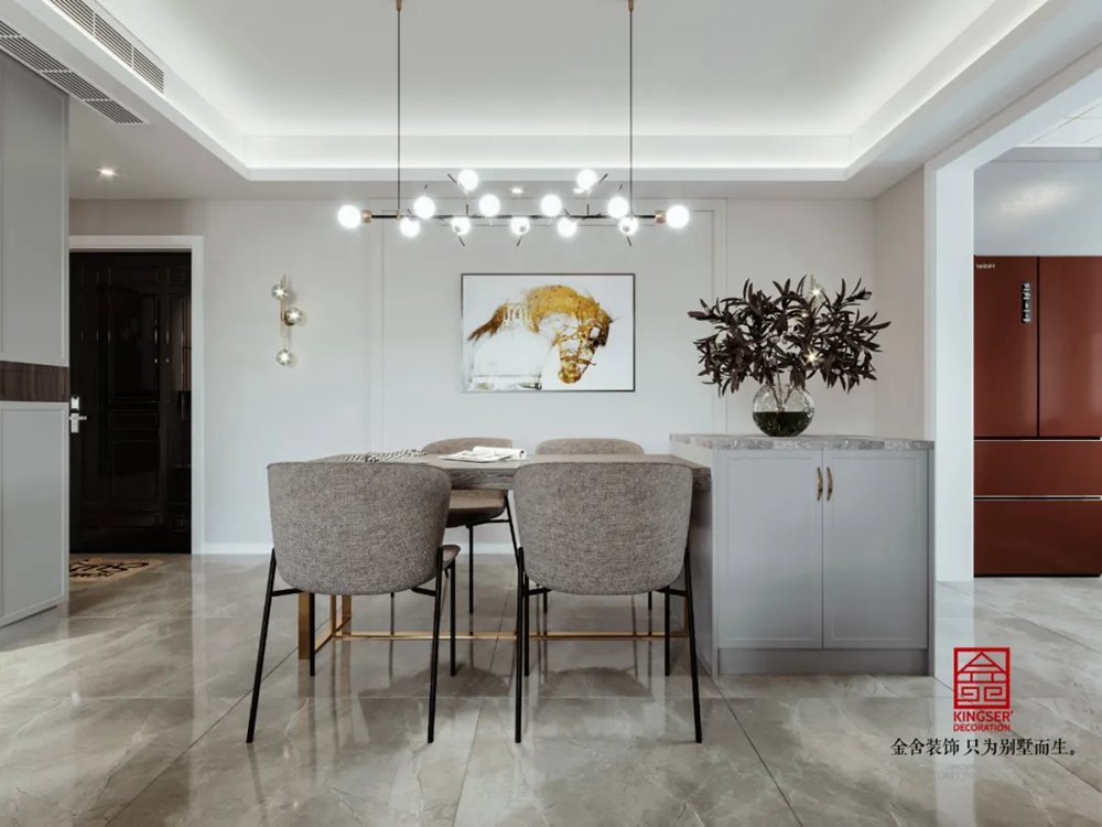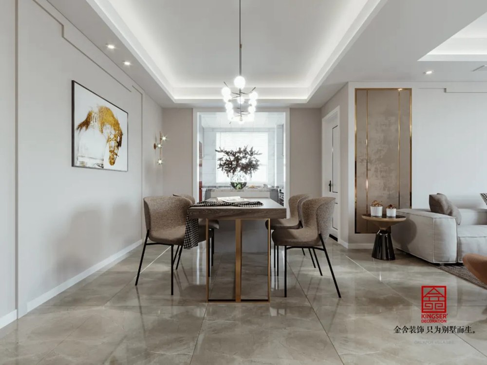 干凈明亮的餐廳空間借由藝術(shù)特質(zhì),有著一氣呵成的輕奢氣派,石材、布藝及金屬等多樣的材質(zhì)運用使得空間靈動而不失活潑。