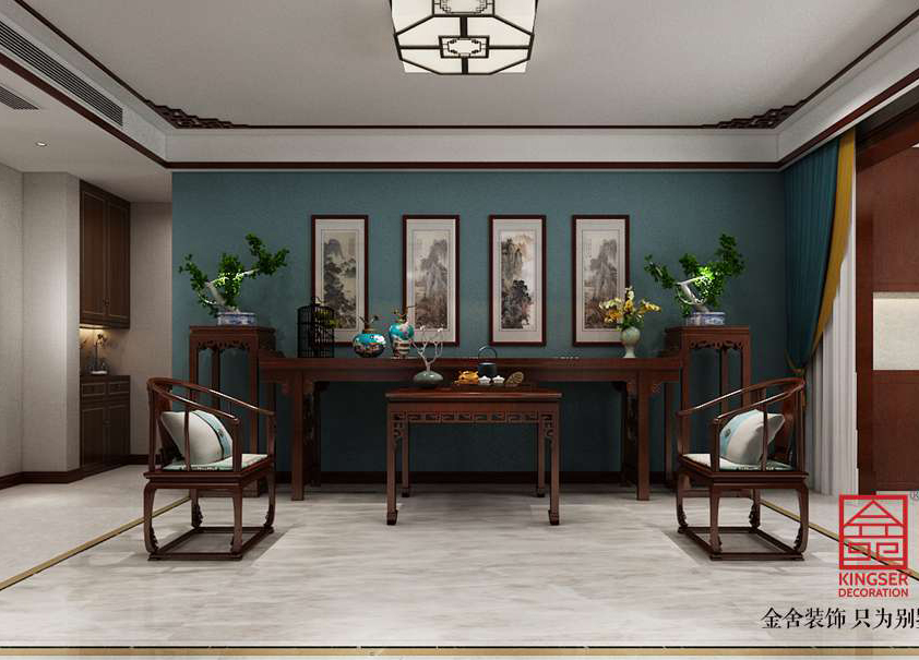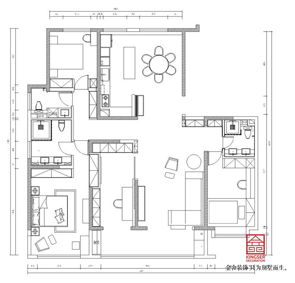 ③餐廳和廚房雖大,但是沒有大宅的風(fēng)范,可以整個把廚房和餐廳都打開,做成圍合式的,這樣更有大宅的感覺