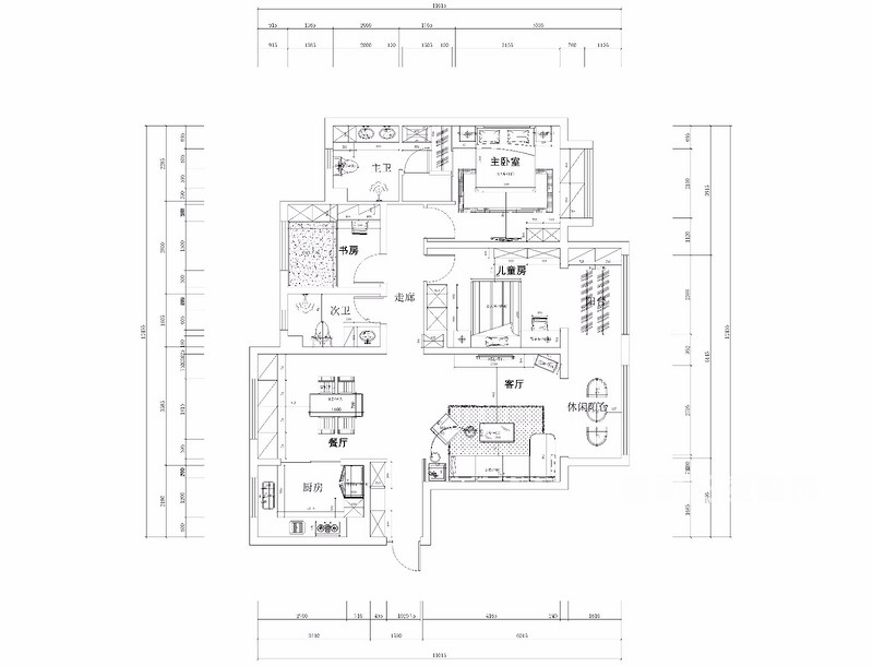 3 走廊和兒童房的雙面收納使客衛(wèi)生間的收納功能有所提升。