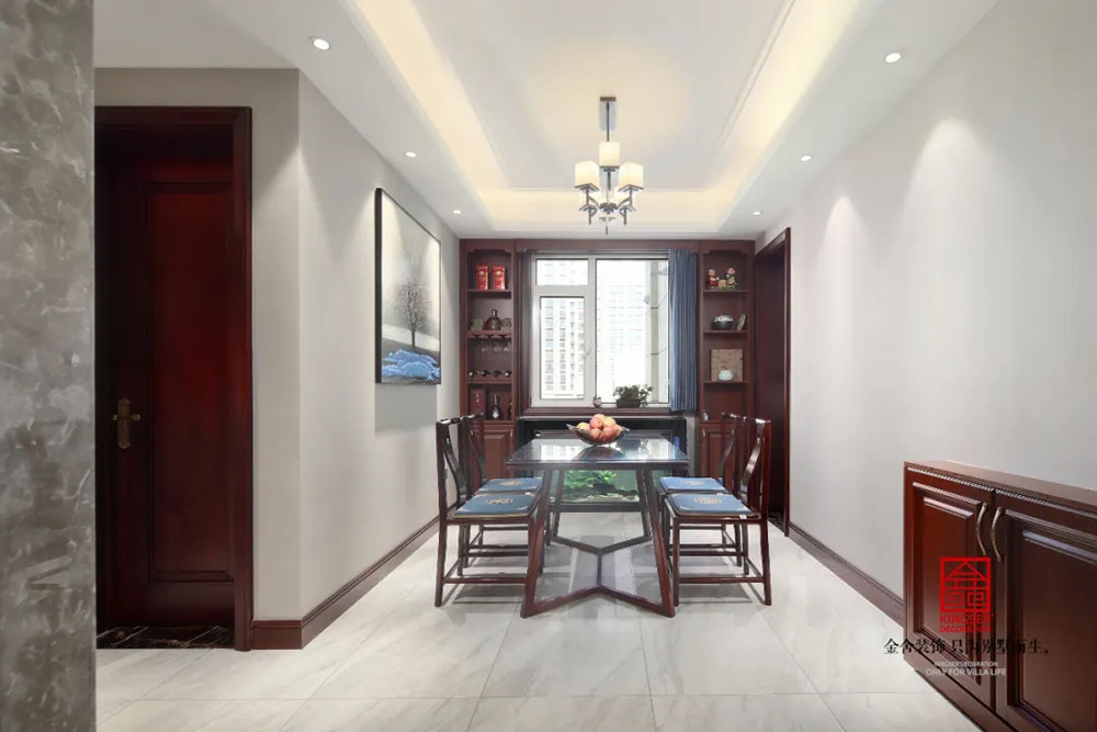 此案例為石家莊金舍裝飾-保利拉菲公館150平米新中式風格裝修實景。新中式風格發(fā)展到現(xiàn)在就像是一個已經(jīng)趨近飽和的瓶子一樣,有水進去自然就會有水流出。對于中式風格來說,每個元素都是不可或缺的一部分,從古代石刻窗格的各種吉慶元素,到現(xiàn)在已經(jīng)簡化到只剩下核心的顏色和少量的配飾,拋繁就簡,回歸平淡,這是一種發(fā)展,也是一種人們對于簡單生活的憧憬和向往。