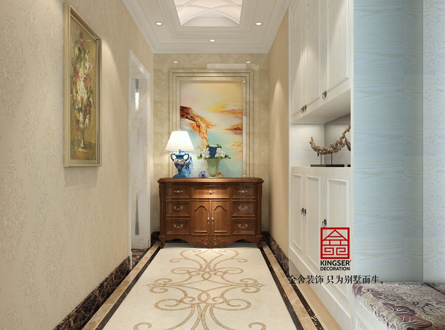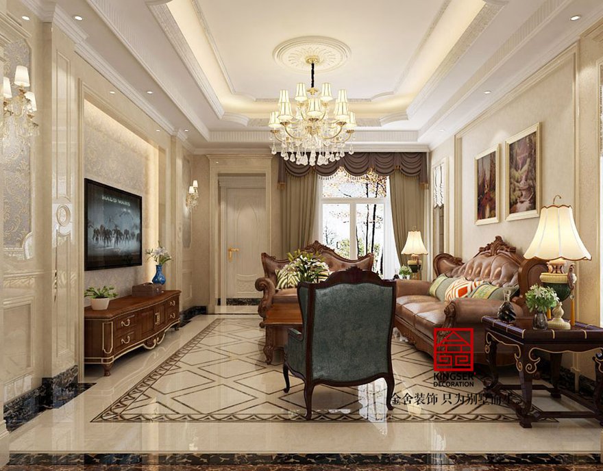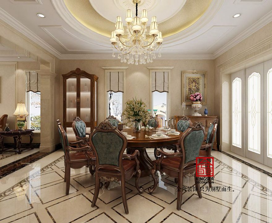 設(shè)計(jì)說明:此案例為石家莊金舍裝飾-原河名墅400平米歐式風(fēng)格裝修效果圖。沒有純歐式的繁亂,客廳與臥室的對(duì)比繁簡(jiǎn)統(tǒng)一,讓人心情平靜。椅子藍(lán)色皮質(zhì)與臥室藍(lán)色布藝相輝映,使之更為整體。束花裝飾點(diǎn)綴及綠植擺設(shè)使整個(gè)空間更加清新田園。田園氣息讓人在忙碌的都市多了份愜意和滿足。金屬材質(zhì)以及水晶吊燈讓整個(gè)空間更為時(shí)尚、大氣。真正做到了大氣而又內(nèi)容。