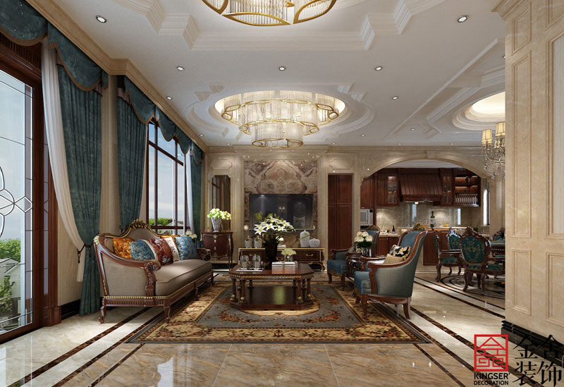 客廳:美式客廳風(fēng)格較多采用嵌入式石膏吊頂,搭配精致的水晶吊頂,營造出一種懷舊、浪漫的感覺。以大理石作為地面裝飾材料,石材作為墻面裝飾材料,光澤感極佳,在沙發(fā)區(qū)域鋪上大幅花紋地毯,使空間區(qū)域劃分更加清晰。復(fù)古造型的組合沙發(fā),以及茶幾都具有上乘的質(zhì)感,讓美式古典風(fēng)格更加的彰顯。