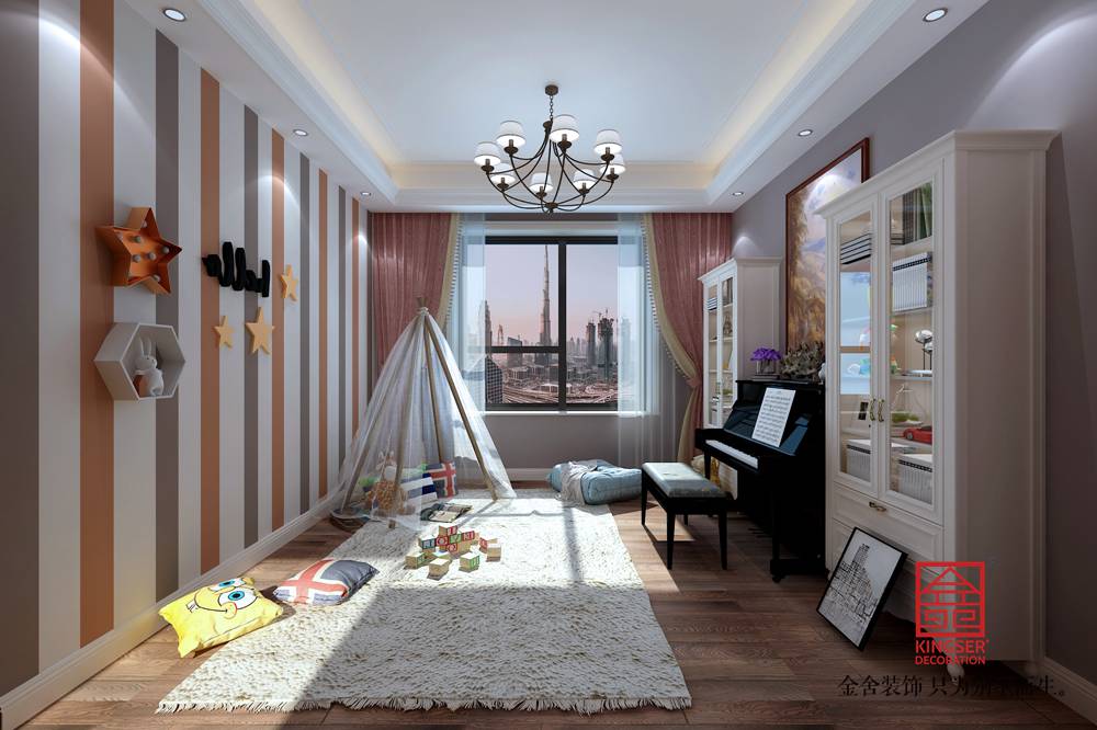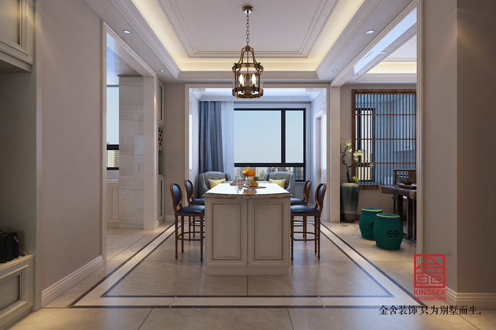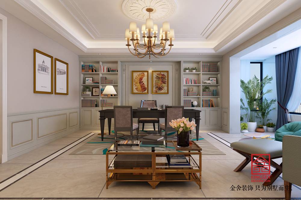 設計說明:此案例為石家莊金舍裝飾-榮盛華府200平米混搭風格裝修效果圖。傳統(tǒng)的客廳以電視墻為主導,沙發(fā)和茶幾的高度往往相差不大,這樣的高度差對于孩子寫作業(yè)或是成年人看書寫字和使用電腦是沒有舒適度可言的,因此一些有工作和學習需求的家庭可以考慮把家庭工作室融入客廳,利用靠墻的大操作臺和各種墻面擱板架,滿足多人工作的需求