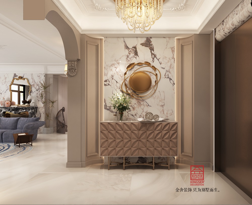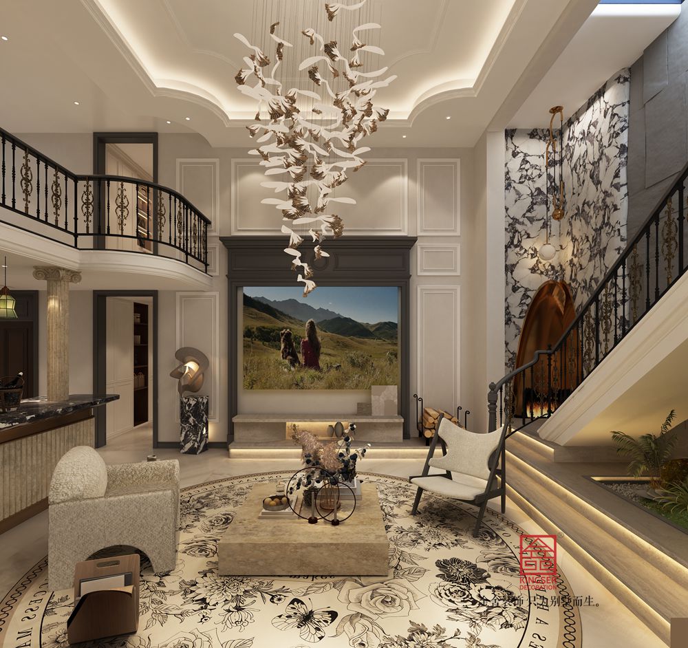 本案挑空客廳以新古典風格為基底,融合現(xiàn)代設計語言。運用經(jīng)典的石膏線、護墻板勾勒空間秩序,搭配簡約造型的家具與藝術吊燈,既保留古典的優(yōu)雅韻味,又注入當代的時尚與靈動,實現(xiàn)傳統(tǒng)與現(xiàn)代的對話。