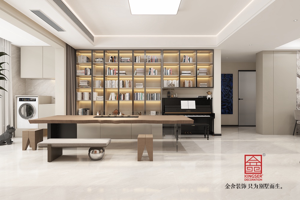 此空間采用去客廳化設(shè)計(jì),打破傳統(tǒng)客廳單一社交功能的局限,打造出集閱讀、藝術(shù)、休閑等多元體驗(yàn)于一體的復(fù)合區(qū)域。 整面玻璃書柜兼具收納與展示功能,暖光加持下,書籍仿若藝術(shù)品,營造出靜謐的閱讀氛圍。原木長桌造型獨(dú)特,成為空間核心,可滿足閱讀、手工等多樣需求,搭配簡約座椅與長凳,為互動交流提供靈活場景。鋼琴的融入,為空間注入藝術(shù)氣息,讓居者能隨時沉浸于音樂世界。