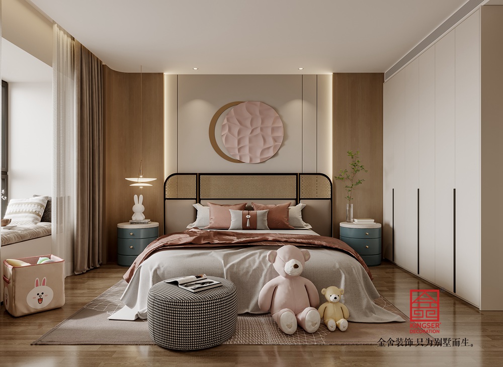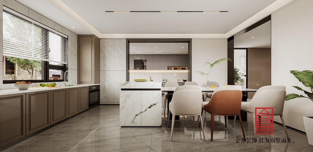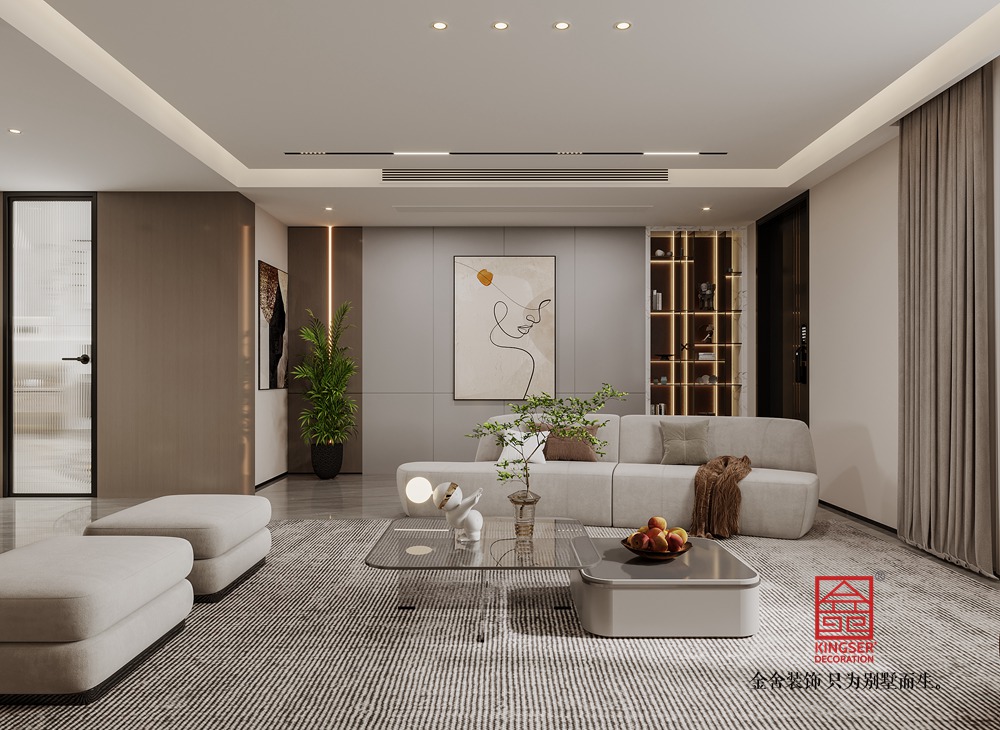 該別墅客廳設(shè)計(jì)遵循現(xiàn)代輕奢與極簡(jiǎn)融合的思路。整體色調(diào)選取低飽和度的暖棕、米白等,構(gòu)建出雅致柔和的基底。大面積的墻面采用簡(jiǎn)潔的板材設(shè)計(jì),干凈利落,與嵌入其中的電視及兩側(cè)帶有燈光點(diǎn)綴的收納格相配合,既滿足實(shí)用需求,又通過(guò)光影變化營(yíng)造出輕奢氛圍。