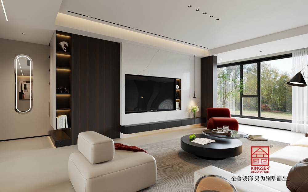 該客廳設(shè)計(jì)緊扣意式輕奢的風(fēng)格。空間以柔和的淺色系為基底,搭配深色木質(zhì)元素,營(yíng)造出平衡且有質(zhì)感的視覺效果。