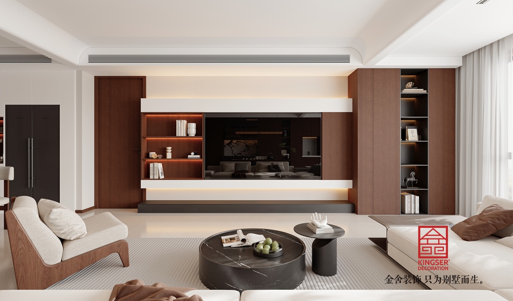 該客廳設計以現(xiàn)代簡約為核心,融合自然溫馨的質感??臻g以淺色調為基礎,搭配深棕色木質柜體,營造出和諧且富有層次的視覺效果。