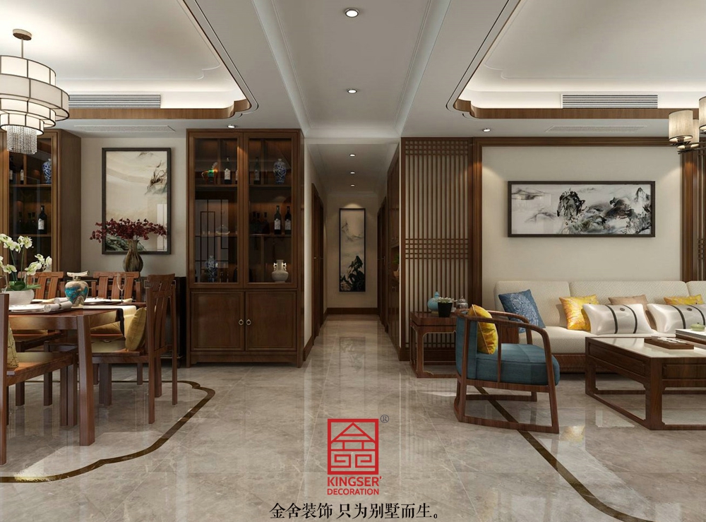 設(shè)計(jì)說明:此案例為石家莊金舍裝飾-東南智匯城153平米中式風(fēng)格裝修效果圖。新中式風(fēng)格是中式元素與現(xiàn)代材質(zhì)的巧妙兼柔的布局風(fēng)格,它同時(shí)明清家具、窗欞、布藝床品相互輝映,經(jīng)典地再現(xiàn)了移步變景的精妙小品。中國風(fēng)并非完全意義上的復(fù)古明清,而是通過中式風(fēng)格的特征,表達(dá)對(duì)清雅含蓄、端莊豐華的東方式精神境界的追求。